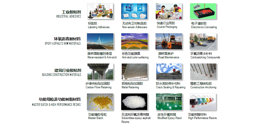 - 各種建筑工程用途環(huán)氧膠黏劑:提供系列戶外建筑黏貼、加固產(chǎn)品,如植筋膠、防水防腐涂料、粘鋼膠、纖維布加固膠、鋼板加固粘結(jié)等。