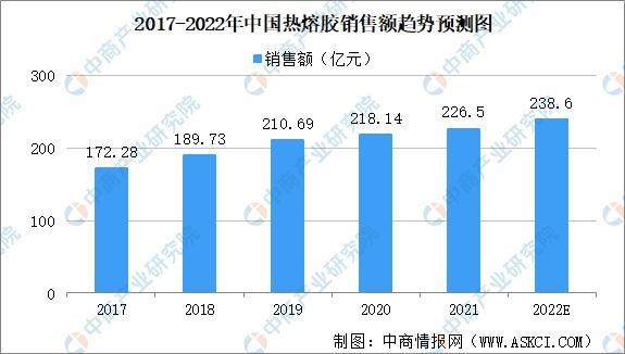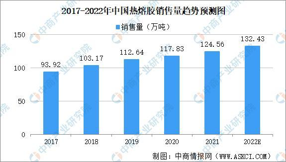 隨著經(jīng)濟(jì)社會的持續(xù)發(fā)展,熱熔膠作為戰(zhàn)略性新興產(chǎn)業(yè)得到大力支持發(fā)展。根據(jù)中國膠粘劑和膠粘帶工業(yè)協(xié)會統(tǒng)計(jì),2020年我國熱熔膠市場總銷售量為117.83萬噸,較2017年年均復(fù)合增長率達(dá)7.85%;總銷售額為218.14億元,較2017年年均復(fù)合增長率達(dá)8.18%。據(jù)中國膠粘劑和膠粘帶工業(yè)協(xié)會預(yù)測,中國大陸擁有全球最大的熱熔膠市場,雖然經(jīng)受新冠疫情影響,但中國經(jīng)濟(jì)基本面向好,經(jīng)濟(jì)韌性足,預(yù)計(jì)2022年熱熔膠市場總銷售量為132.43萬噸,總銷售額為238.6億元。