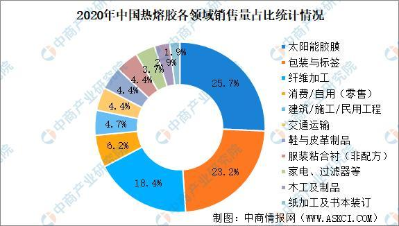 我國熱熔膠銷售的下游應(yīng)用領(lǐng)域主要以太陽能膠膜、包裝與標(biāo)簽、纖維加工等行業(yè)為主,2020年太陽能膠膜領(lǐng)域熱熔膠銷量占比最大達(dá)25.7%,包裝與標(biāo)簽、纖維加工領(lǐng)域熱熔膠銷量占比分別為23.2%、18.4%。太陽能膠膜、包裝與標(biāo)簽、纖維加工領(lǐng)域熱熔膠銷量占比合計(jì)67.3%。