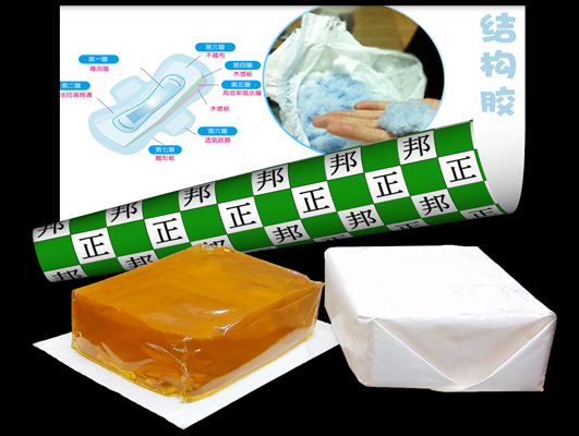 結(jié)構(gòu)膠用于:粘接無紡布/打孔膜與pe背膜,粘接吸水紙與無紡布、PE或絨毛漿;粘接彈性腰圍與PE背膜;粘接立體防漏成型;粘接形成牢同的四周密封,使芯體材料穩(wěn)同并緊密接觸。