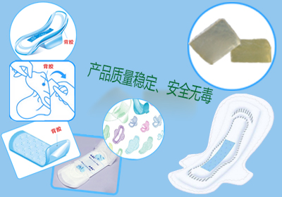 (4)橡筋膠:同定松緊材料的作用,使松緊材料更好地粘接在無紡布與底膜上而,給予衛(wèi)生用品更好的貼身舒適感,更好的防漏性能。