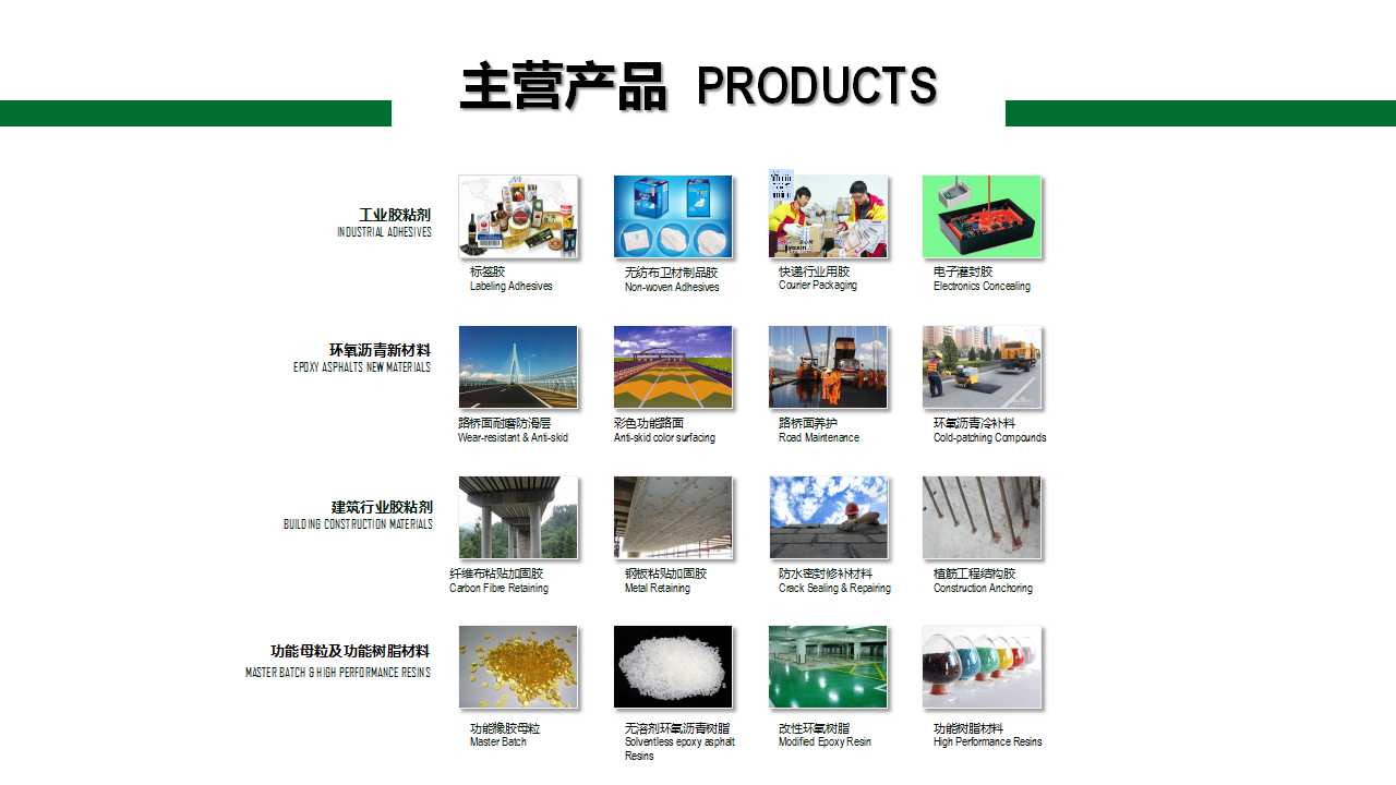 公司以創(chuàng)新技術(shù)為主導(dǎo),品質(zhì)服務(wù)為宗旨,環(huán)境保護(hù)為準(zhǔn)則,集研發(fā)、生產(chǎn)、銷售和服務(wù)于一體,為用戶提供各種高科技、高實(shí)用價(jià)值的工業(yè)和建筑用途膠粘劑以及環(huán)保型路橋鋪設(shè)材料,產(chǎn)品系列包括用于工業(yè)產(chǎn)品粘結(jié)的熱熔壓敏膠黏劑、用于建筑工程結(jié)構(gòu)加固修補(bǔ)的環(huán)氧膠,和用于路橋面鋪設(shè)的環(huán)氧瀝青膠。