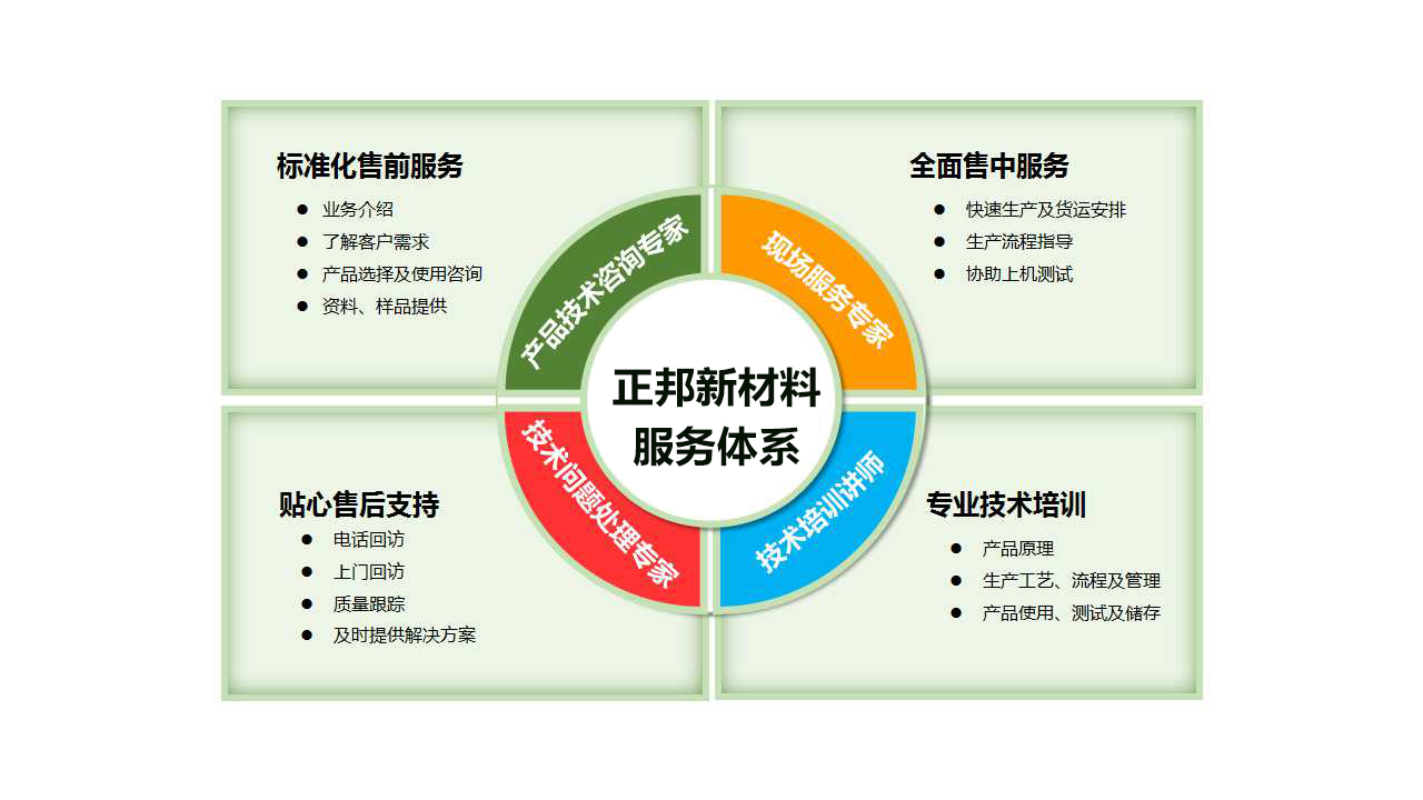自正邦新材料成立起,公司就建立了專門的客戶服務(wù)部,經(jīng)過多年不懈努力,形成了專業(yè)顧問式的營(yíng)銷、樣品測(cè)試、生產(chǎn)工藝服務(wù)等一體化完整的服務(wù)體系,以高質(zhì)量的產(chǎn)品和完善的技術(shù)支持,獲得了良好的信譽(yù)口碑。